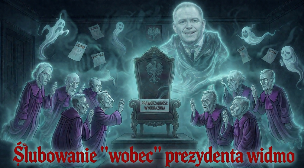 Czy można zostać sędzią Trybunału Konstytucyjnego, składając przysięgę do pustego fotela? Dzisiejsze wydarzenia w Warszawie to nie reforma, to seans spirytystyczny. Analizujemy, dlaczego „praworządność wyobrażona” to najbardziej niebezpieczna halucynacja obecnej władzy i co się dzieje, gdy elita prawnicza zaczyna widzieć rzeczy, których nie ma. Tekst o końcu logiki, magikach z PRL-u i sędziach, którzy zaczęli karierę od poświadczenia nieprawdy.